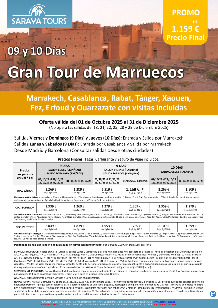 Gran Tour 9/10 días: Rak, Cmn, Rabat, Tánger, Xaouen, Fez, Merzouga, Ouarzazate con Visitas Incl. hasta Dic26