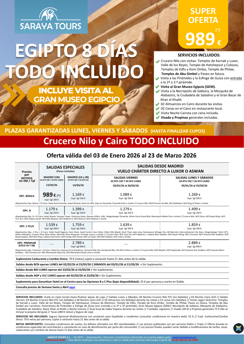 Egipto Todo Incluido 8d. *Salidas Mad,Bcn,Bio,Agp,Vlc* Crucero y Cairo+ visitas, Propinas y Visado. Desde 939€